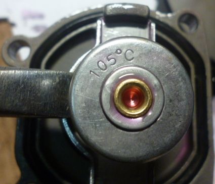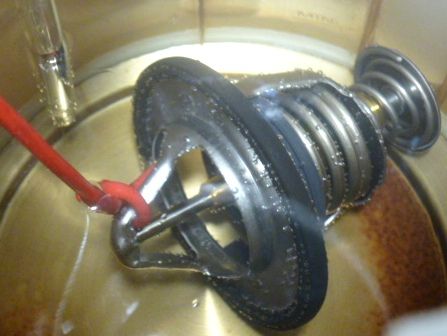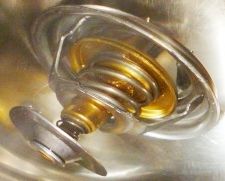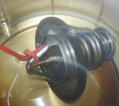 Как правило, на клапан термостата надето резиновое уплотнительное кольцо, но встречаются термостаты и без такого коль-ца. Перетекание небольшого количества антифриза через уплотнительное кольцо не будет являться дефектом, поскольку не влияет на общий нагрев антифриза в системе охлаждения, а еще и потому, что в большинстве клапанов термостатов заво-дом изначально установлен перепускной клапан для предотвращения образования воздушной пробки – следовательно, сам завод допускает незначительное перетекание небольшой части антифриза. Как проверять? Наливаем в ёмкость для нагрева антифриз или воду (в воде лучше видно, но это только, если температура открытия термостата ниже 100 град. С) так, чтобы покрывался весь термостат, чтобы визуально можно было наблюдать начало открытия его клапана. Также в антифриз погру-жаем термометр (предел – не ниже 150 град.С) или термопару. Включаем нагрев и контролируем визуально температуру и начало открытия клапана. Проводим не менее 2-3 циклов нагрева. Если открытие клапана происходит в указанных пределах – термостат исправен. Можно сделать планку со стержнем, упирающимся в клапан термостата – тогда визуально со стороны (поскольку антифриз выделяет много вредных паров при нагреве больше 100 град. С и дышать его парами вредно) можно наблюдать движение стержня, что укажет на открытие клапана термостата.